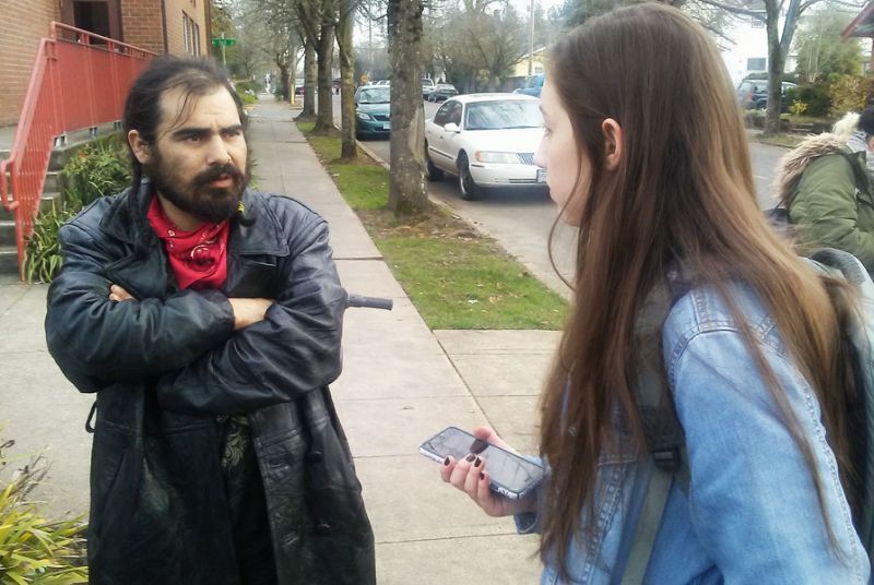Mark, who also goes by the street name Okie, is interviewed outside McMinnville Cooperative Ministries by Rilee Macaluso, a mass communications major at Linfield College, as part of a project Macaluso is doing to document the people living on the streets.